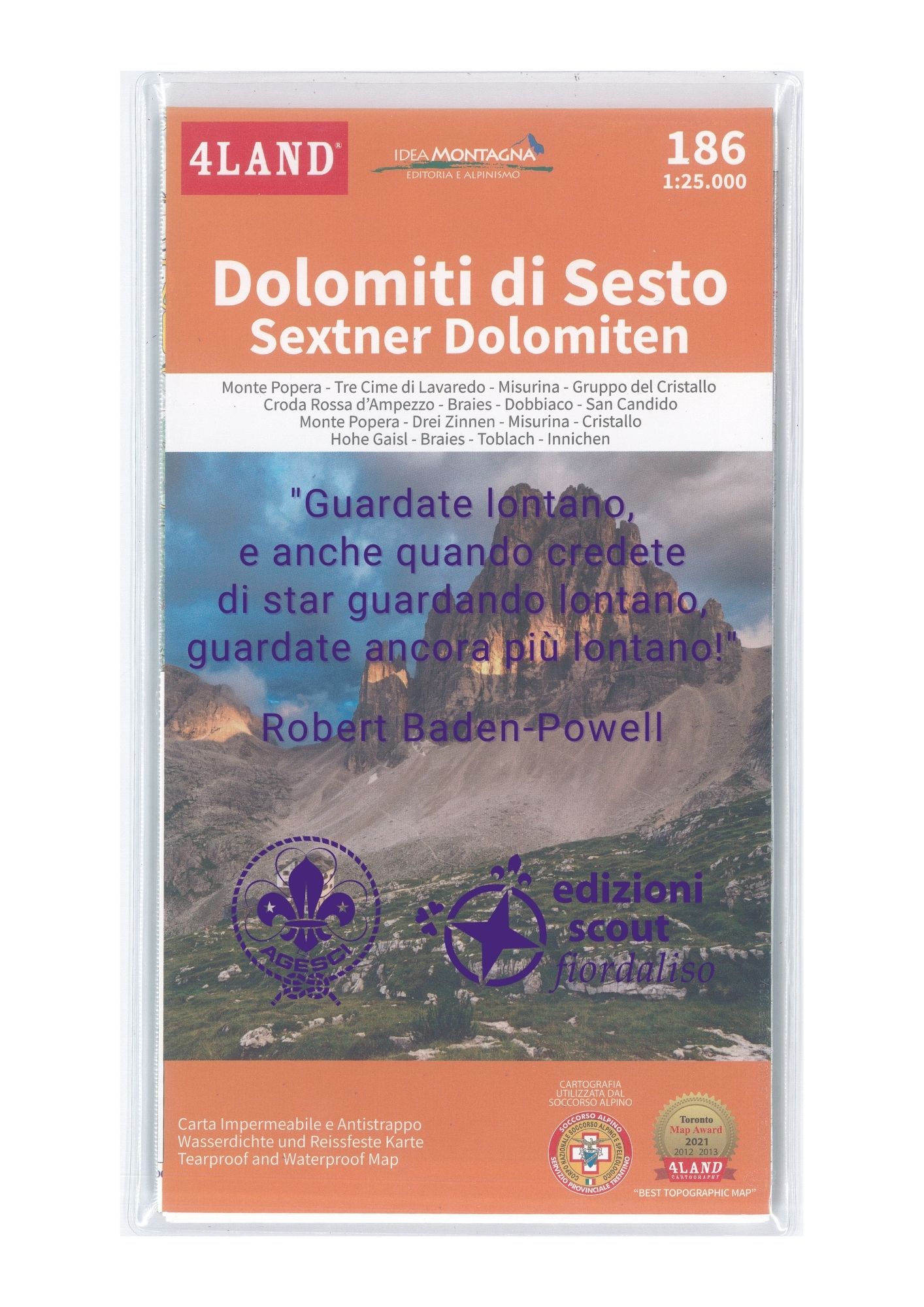 Il packaging, realizzato in plastica 100% riciclabile è personalizzato con stampa a un colore (viola associativo) e riporta una citazione di Baden-Powell, l’Emblema AGESCI e il logo edizioni scout fiordaliso sul lato frontale e un righello e uno scalimetro sul retro per agevolare la consultazione delle mappe.